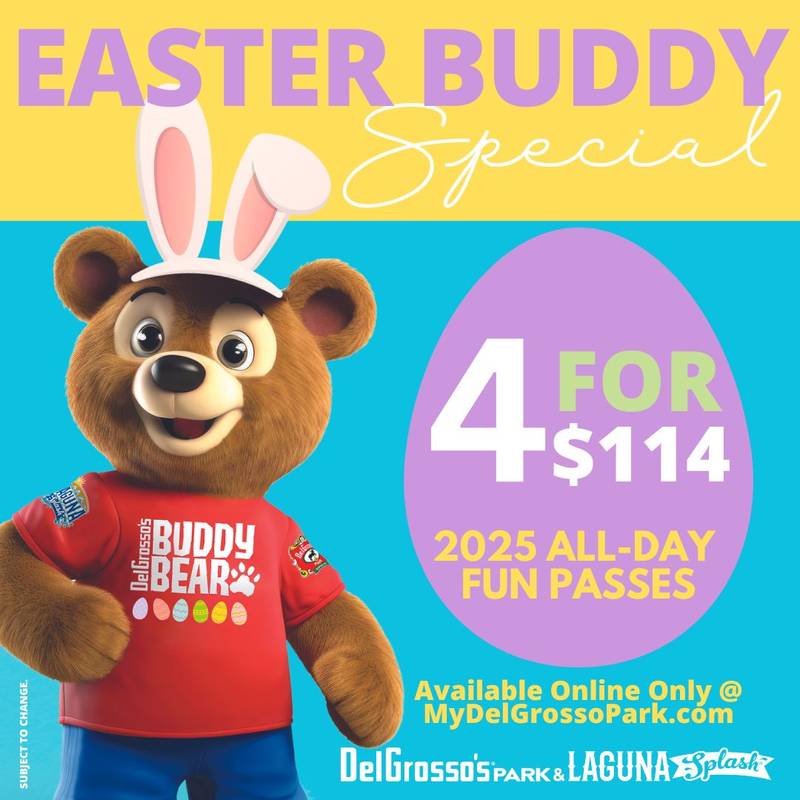 Now thru Feb 16th - Get Four (4) 2026 All-Day Fun Passes for just $117 (Avail. Online Only). That's a Buy 3 Get 1 FREE Deal! All-Day Fun Passes are Single Day Passes to DelGrosso's Park & Laguna Splash and are not to be confused with Season Passes. These Printable All-Day Fun Pass Vouchers can be given as a pack or split among multiple recipients and are valid thru 9/27/26. All-Day Fun Pass Regular Price: $39 ea.