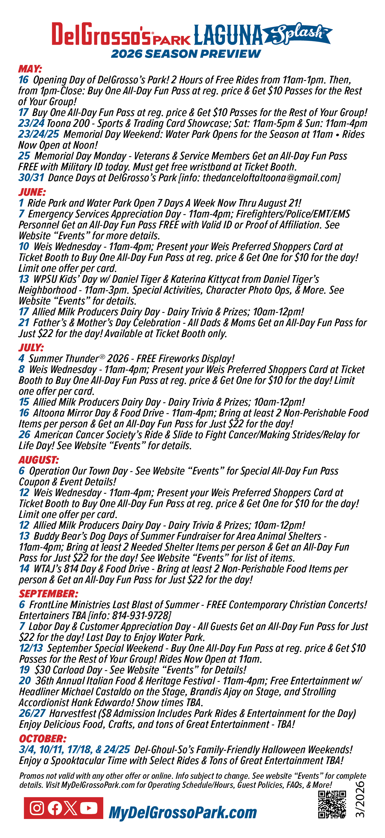 Upcoming Events May 2026 Opening Day of DelGrosso's Park May 16 free entrypark Learn more Opening Weekend Sunday Special May 17 park Learn more Toona 200 – Sports & Trading Card Showcase May 23 - May 24 free entry Learn more Memorial Day Weekend & Water Park Opens For The Season May 23 - May 25 park Learn more Dance Days at DelGrosso's Park May 30 - May 31 foodfree entry Learn more June 2026 Emergency Services Appreciation Day Jun 07 foodfree entrypark Learn more Weis Wednesday Deal - June 10th from 11am-4pm Jun 10 park Learn more WPSU KIDS' DAY - w/ Daniel Tiger Jun 13 free entry Learn more Allied Milk Producers Dairy Day - June 17th from 10am-12pm Jun 17 park Learn more Father's & Mother's Day Celebration Jun 21 park Learn more July 2026 Summer Thunder Free Fireworks Show Jul 04 free entry Learn more Weis Wednesday Deal - July 8th from 11am-4pm Jul 08 park Learn more Allied Milk Producers Dairy Day - July 15th from 10am-12pm Jul 15 park Learn more Altoona Mirror Day & Food Drive - A Great Deal for a Great Cause! Jul 16 park Learn more Ride & Slide To Fight Cancer Day Jul 26 park Learn more August 2026 Operation Our Town Day Deal Aug 06 park Learn more Allied Milk Producers Dairy Day - Aug. 12th from 10am-12pm Aug 12 park Learn more Weis Wednesday Deal - Aug. 12th from 11am-4pm Aug 12 park Learn more Dog Days of Summer Celebration Fundraiser - A Great Deal for a Great Cause! Aug 13 park Learn more WTAJ's 814 Day & Food Drive Aug 14 park Learn more September 2026 FrontLine Ministries Last Blast of Summer FREE Christian Concerts Sep 06 musicfree entry Learn more Labor Day & Customer Appreciation Day Deal! Sep 07 park Learn more September Special Weekend - Sept. 12-13 Sep 12 - Sep 13 park Learn more $30 Carload Sale Day Sep 19 park Learn more Italian Food & Heritage Festival Sep 20 foodmusic Learn more 39th Annual Harvestfest Sep 26 - Sep 27 foodmusicpark Learn more October 2026 Del-Ghoul-So's - Oct. 3-4 Oct 03 - Oct 04 park Learn more Del-Ghoul-So's - Oct. 10-11 Oct 10 - Oct 11 park Learn more Del-Ghoul-So's - Oct. 17-18 Oct 17 - Oct 18 park Learn more Del-Ghoul-So's - Oct. 24-25 Oct 24 - Oct 25 park Learn more 2026 Events Preview download 2026 Events Listing chevron right icon